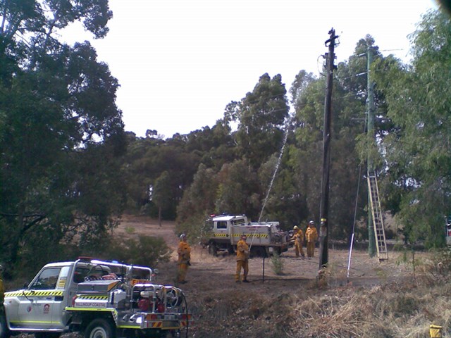 On Monday morning at about 1030 Dean Henry spotted a pole top fire in Caves Road between Gunyulgup and Marrinup Drives on Michael Gregg’s property. He called it into David Hunt and 000 then efficiently put out the initial leaf litter fire at the base of the pole – wearing his PPE pink flip flops.