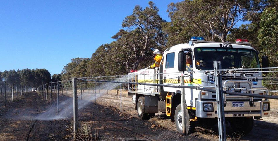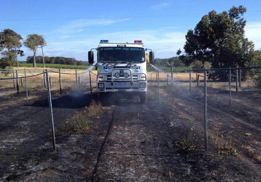 The fire was in a vineyard and the narrow rows made the job more difficult, requiring the use of the front spray bar and static hoses from the work platform.