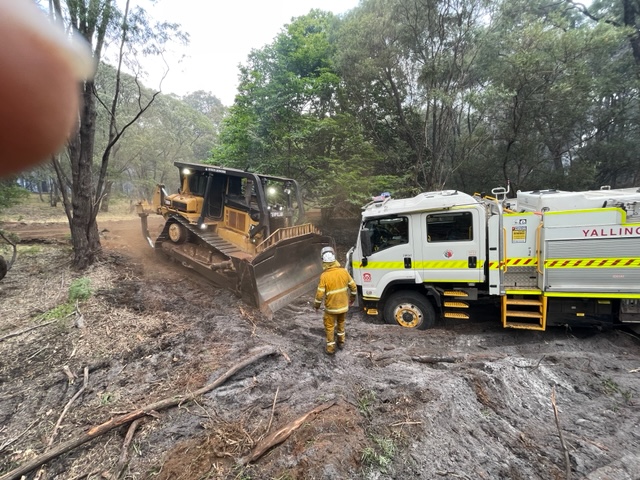 DAYTIME: Difficult terrain bogging Yallingup Rural truck; Recovery operation with heavy tracked machinery